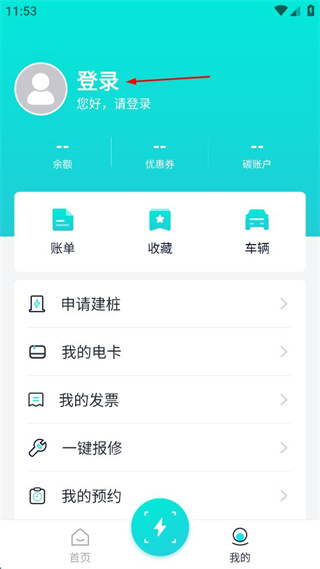 3、在我的頁面中,找到登錄區域,點擊該區域進入歡迎登錄國恒充電界面。