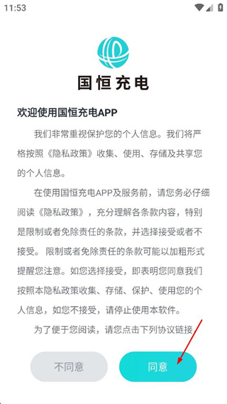 1、打開國恒充電APP出現隱私政策提示,閱讀內容后點擊同意按鈕進入軟件。