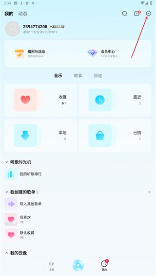 2、進入我的頁面內,在創建歌單右側點擊+的圖標。