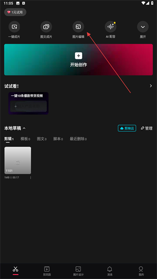 1、啟動剪映的APP,進入首頁點擊上方圖片編輯的按鈕。