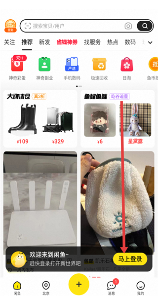 1、在閑魚APP首頁點擊“馬上登錄”,進入登錄頁面。