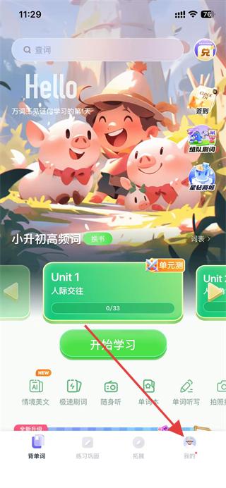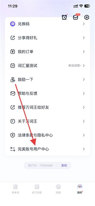 1、打開萬詞王軟件,進入背單詞主界面,點擊底部我的圖標,進入個人相關界面。