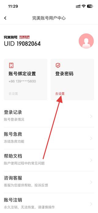 3、進入用戶中心頁面后,點擊登錄密碼區域的去設置。