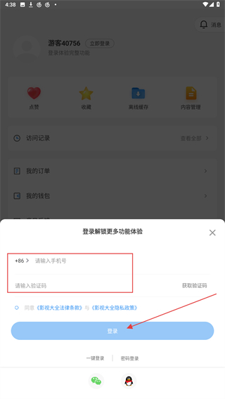 3、在下方彈出的方式,輸入手機號、驗證碼,再點擊登錄的按鈕。