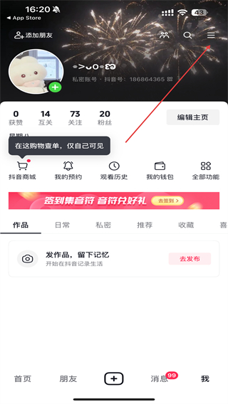 3、登錄后,再點擊我到個人主頁中心,查看用戶昵稱、頭像、抖音號是否顯示,顯示成功代表已登錄。