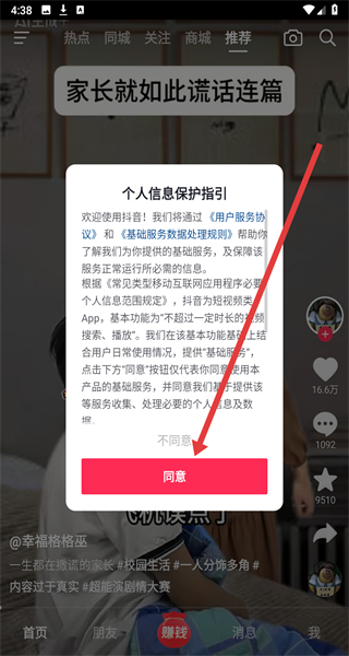 1、在抖音APP的“個人信息保護指引”彈窗點擊“同意”,進入抖音主界面。