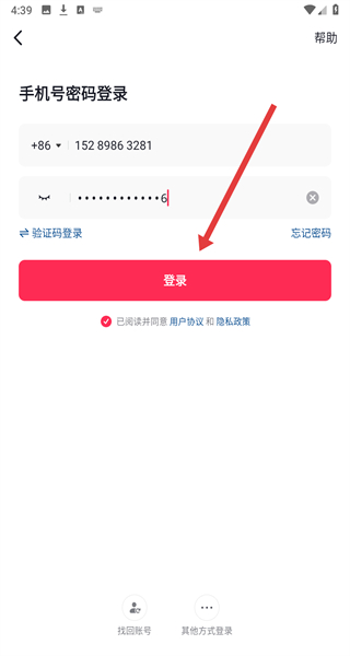 4、輸入手機號碼和密碼,勾選協議后點擊“登錄”按鈕,完成賬號登錄。