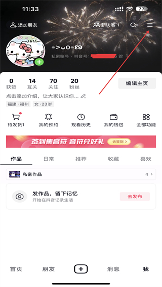 2、進入我的頁面內,點擊右上角的功能按鈕。