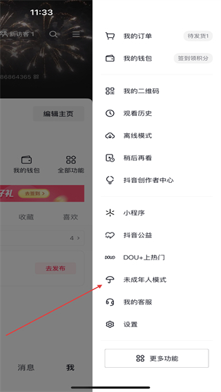 3、在右側彈出的菜單欄中,點擊下方未成年人模式。