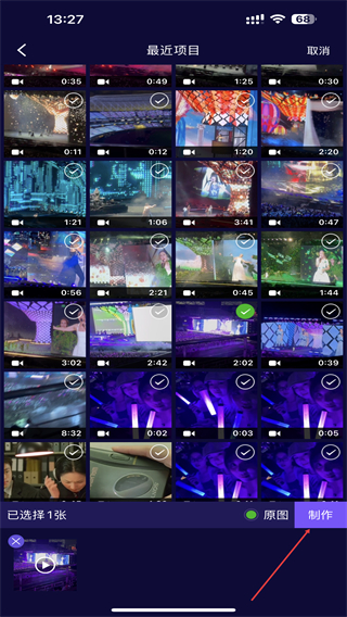 2、進入視頻選擇的頁面內,選擇后點擊制作的按鈕。