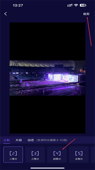 3、進入剪輯的頁面內,選擇下方四等分再點擊右上角裁剪即可。