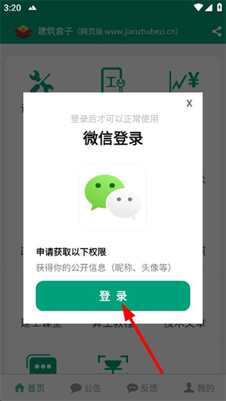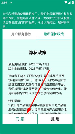 1、打開建筑盒子app,在隱私政策彈窗中點擊同意。