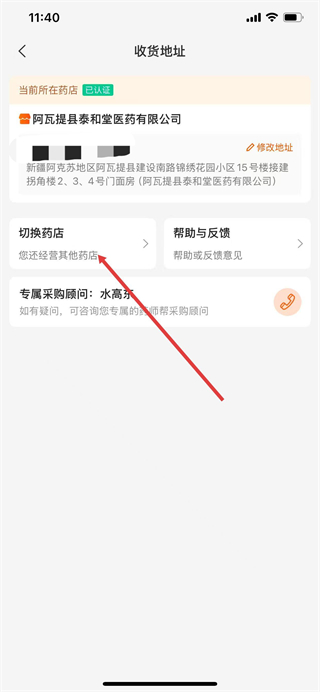 3、在收貨地址頁面,點擊切換藥店選項。
