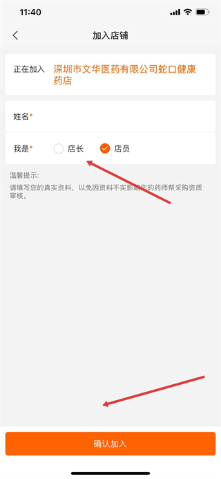 6、在加入店鋪頁面,填寫姓名并選擇身份,點擊確認加入完成藥店信息添加。