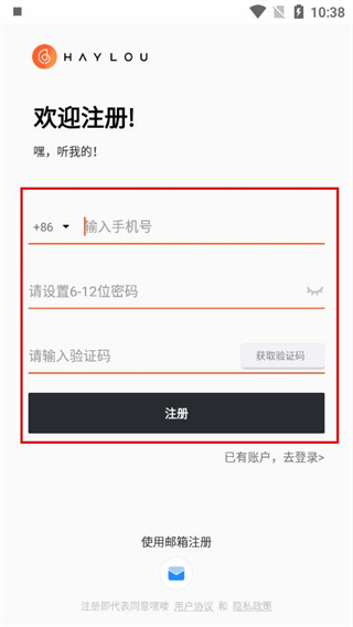 3、輸入手機號碼,設置密碼,輸入驗證碼,點擊注冊,即可完成賬號注冊操作。