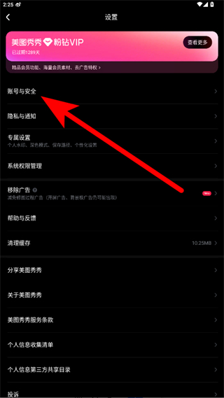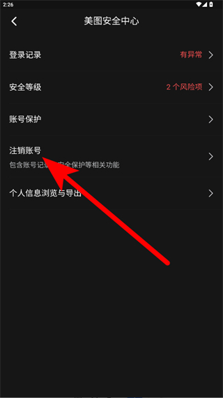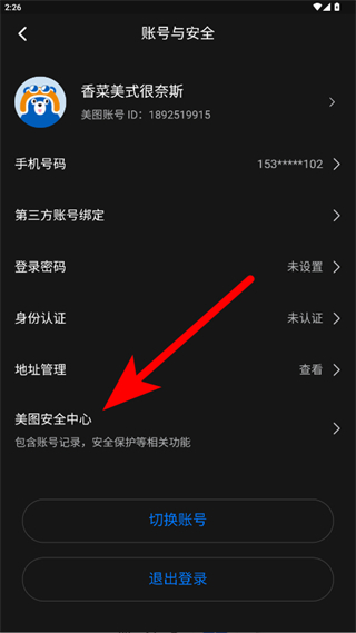 4、在賬號與安全頁面點擊美圖安全中心,進入美圖安全中心頁面后點擊注銷賬號,按照提示完成美圖秀秀賬戶的注銷操作。
