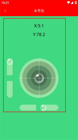 3、返回主界面點擊水平儀圖標,觀察X、Y數值和氣泡位置判斷設備水平。