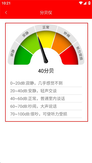 2、點擊分貝儀圖標,進入界面查看當前環境分貝數值及聲音狀態說明。