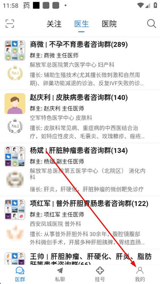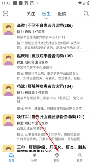 1、打開就醫號app,點擊底部掛號選項,進入醫生列表頁面。