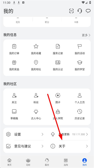 2、在我的個人頁面中,找到關于選項并點擊,進入關于相關的信息界面。