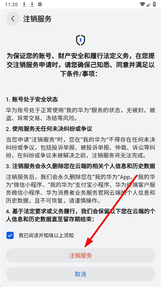 4、在注銷服務頁面,勾選我已閱讀并知曉以上須知后,可按提示操作注銷服務。