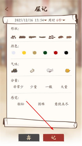 3、在記錄頁面選擇便便的形狀、顏色等信息后,點擊記,完成本次記錄。