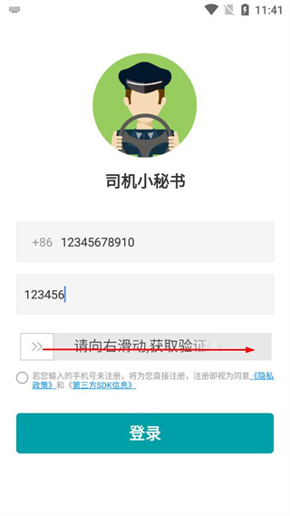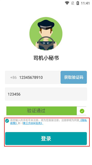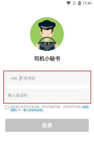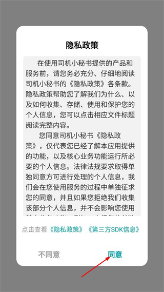 1、打開司機小秘書APP,查看彈出的隱私政策提示,點擊界面中的同意按鈕進入應用。