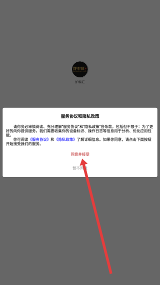 1、打開爐料匯應用,彈出服務協議和隱私政策彈窗,點擊同意并接受按鈕,方可繼續使用應用功能。