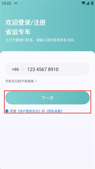 3、填寫完手機號后,勾選同意用戶服務協議和隱私政策的選項,點擊下一步按鈕繼續操作。