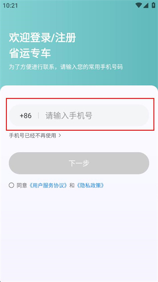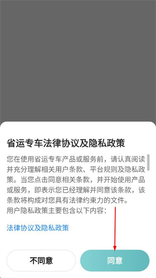 1、打開省運專車APP,查看彈出的法律協議及隱私政策內容,點擊界面下方的同意按鈕進入應用。