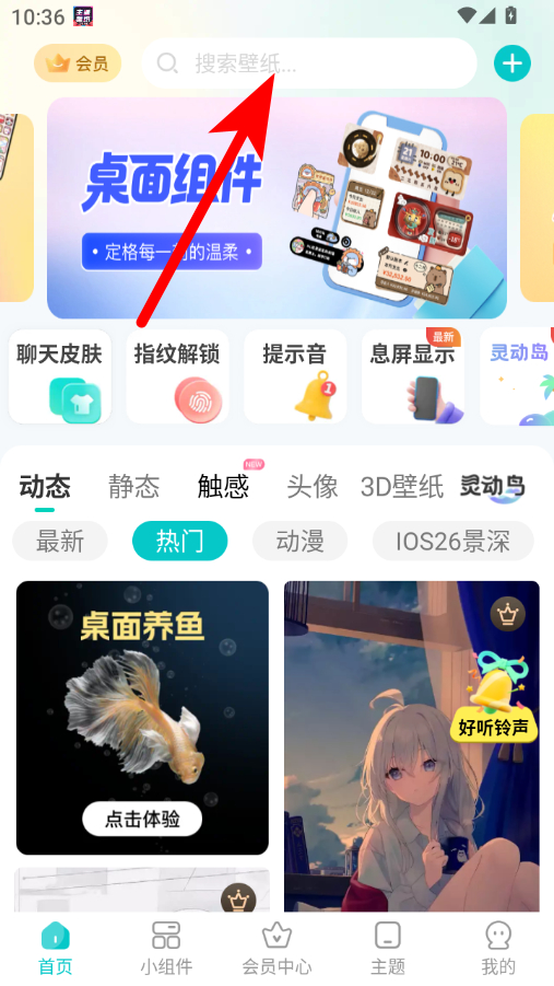 1、在主題壁紙大全首頁,點擊頂部搜索框,進入搜索界面。