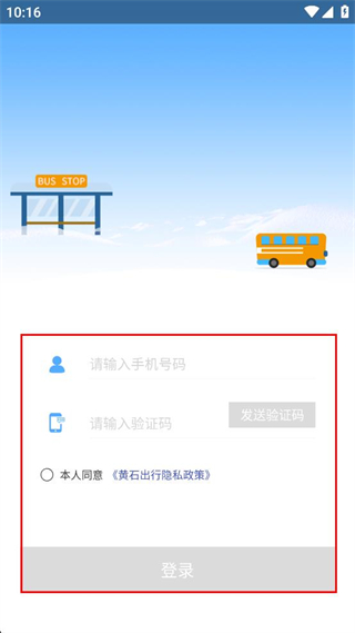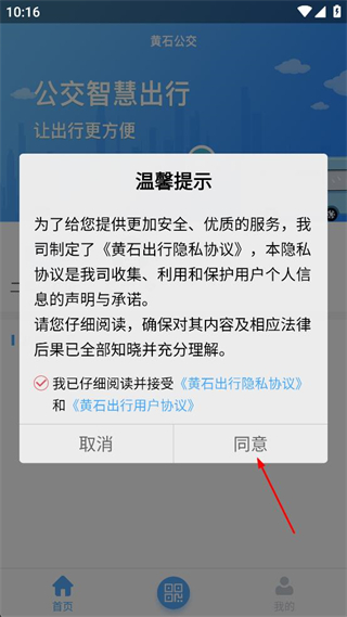 1、打開黃石公交軟件,出現溫馨提示彈窗后,勾選已閱讀協議選項,點擊同意按鈕。