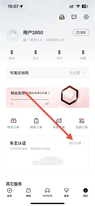 2、在頁面中找到車主認證模塊,點擊其右側的綁定車輛選項,進入車輛綁定的操作界面。