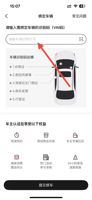 3、在頁面的輸入框中,填寫需綁定車輛的VIN碼,點擊頁面底部的提交綁車按鈕,即可完成車輛綁定操作。