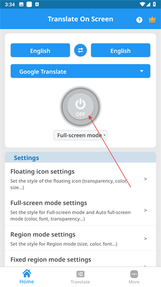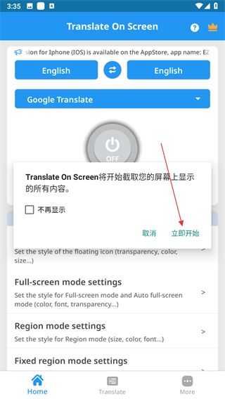 1、打開屏幕翻譯器應用,點擊中間的電源開關按鈕。
