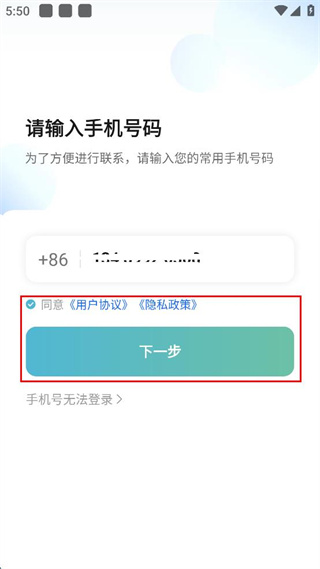 2、確認手機號碼填寫準確且協議已勾選后,點擊界面中的下一步按鈕推進流程。