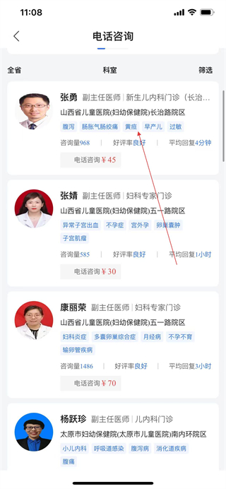 3、在電話咨詢頁面,挑選目標醫生,點擊對應的電話咨詢發起服務。