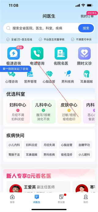 2、進入問醫生頁面后,選擇電話咨詢功能入口。