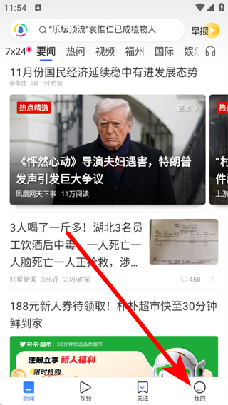 1、打開騰訊新聞APP,點擊右下角我的,進入個人頁面。