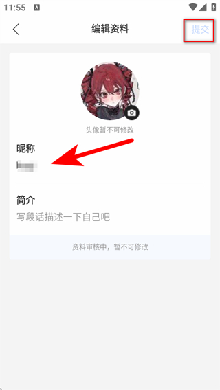 4、在編輯資料頁找到昵稱輸入框,輸入新的昵稱后,點擊右上角提交。