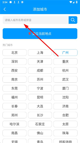 3、在添加城市界面,可通過搜索框輸入城市名,或直接選擇熱門城市列表中的目標城市完成添加。