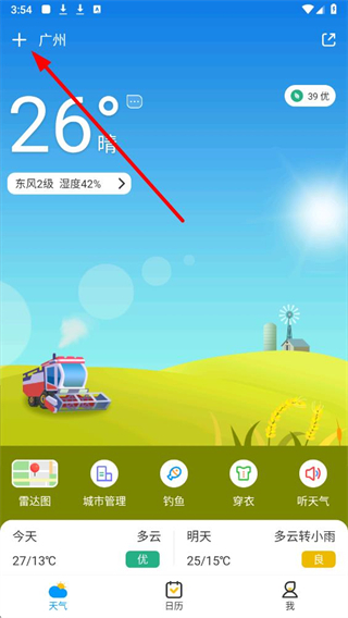 1、在天氣預報通應用首頁,找到左上角的添加按鈕并點擊,進入城市管理相關的操作頁面。