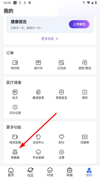 2、在健康報告訂單模塊的頁面中,找到更多功能區域里的草稿箱選項,點擊進入草稿箱頁面。