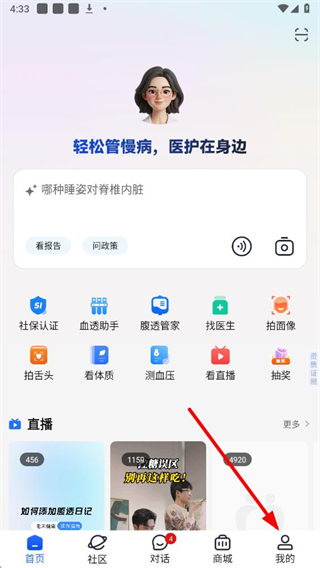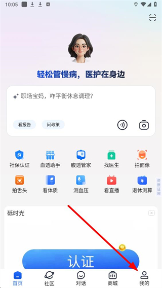 1、在老來健康首頁界面,找到底部導航欄最右側的我的選項,點擊進入對應頁面。