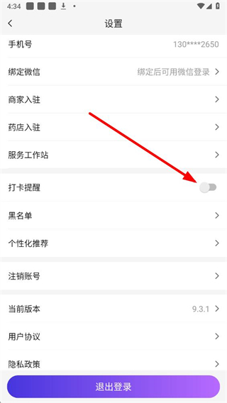 3、在設置頁面,找到打卡提醒選項,點擊開關按鈕,即可開啟或關閉該功能。