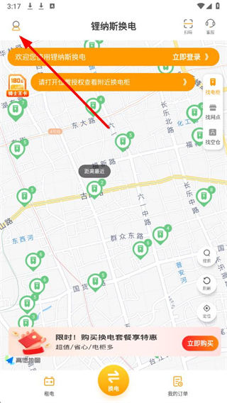 1、在鋰納斯換電應用界面,找到頁面左上角的個人中心圖標并點擊,進入個人頁面。