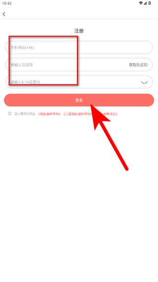 4、在注冊界面填寫手機號碼、驗證碼、設置密碼,勾選同意相關協議后點擊登錄,完成賬號注冊。