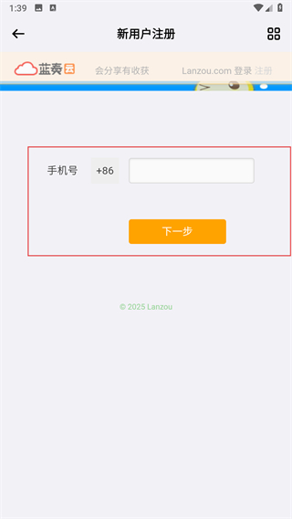 2、在新用戶注冊頁面的手機號輸入框中填寫需要注冊的手機號碼后點擊下一步。