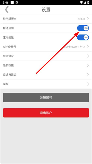 3、在設置界面,找到推送通知選項,點擊其右側的開啟按鈕即可關閉推送。