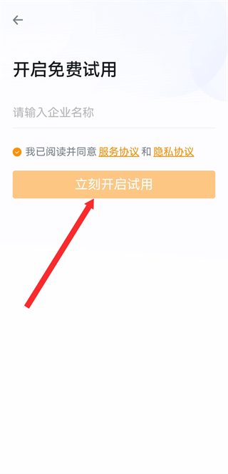 3、進入開啟免費試用頁面,輸入企業名稱后,點擊立刻開啟試用完成注冊。